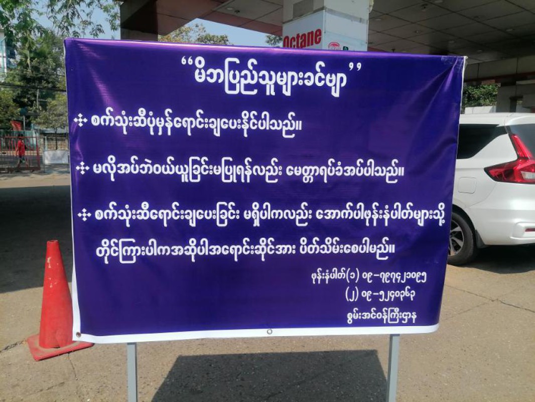 ထို႔ျပင္ ရန္ကုန္ၿမိဳ႕အတြင္း စက္သုံးဆီဆိုင္မ်ားတြင္လည္း စြမ္းအင္ဝန္ႀကီးဌာနက “စက္သုံးဆီပုံမွန္ေရာင္းခ်ေပးႏိုင္ပါသည္။ မလိုအပ္ဘဲဝယ္ယူျခင္းမျပဳရန္လည္း ေမတၱာရပ္ခံအပ္ပါသည္။ စက္သုံးဆီေရာင္းခ်ေပးျခင္း မရွိပါကလည္း ေအာက္ပါဖုန္းနံပါတ္မ်ားသို႔ တိုင္ၾကားပါကအဆိုပါအေရာင္းဆိုင္အား ပိတ္သိမ္းေစပါမည္”ဟူ ေသာစာတန္းမ်ားခ်ိတ္စြဲကာ သက္ဆိုင္ရာၿမိဳ႕နယ္တာဝန္ရွိသူ ဖုန္းနံပါတ္မ်ားကိုလည္း ေဖာ္ေျပေပးထားေၾကာင္း သိရသည္။