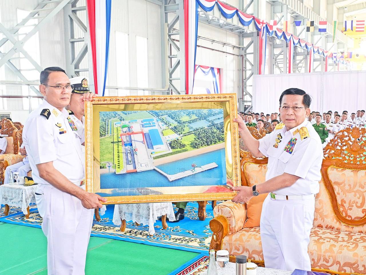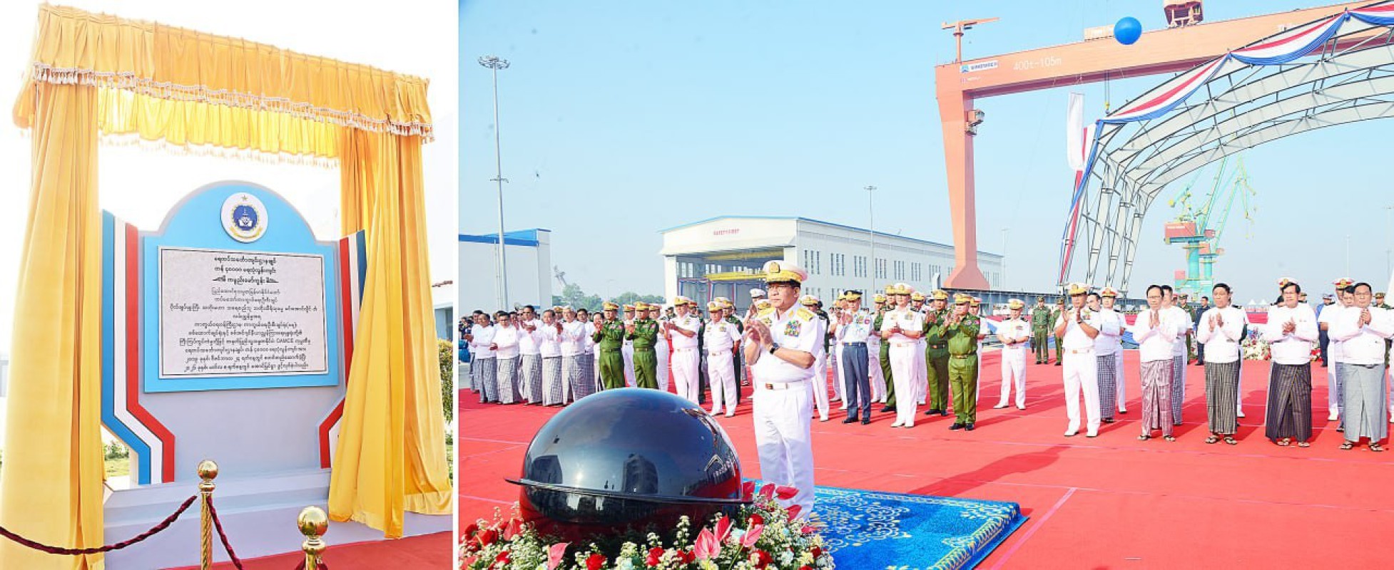 တပ္မေတာ္(ေရ)မွ ေရတပ္သေဘၤာက်င္းဌာနခ်ဳပ္ တန္ ၄၀,၀၀၀ ေရလုံလြန္းက်င္း ဖြင့္ပြဲအခမ္းအနား၊ ေရငုပ္သေဘၤာတိုက္ဖ်က္ေရး ေရယာဥ္မ်ား၏ ဧရာခင္းမဂၤလာအခမ္းအနားႏွင့္ စစ္ေရယာဥ္မ်ား တပ္ေတာ္ဝင္ျခင္းအခမ္းအနားမ်ားအား ႏိုင္ငံေတာ္လုံၿခဳံေရးႏွင့္ ေအးခ်မ္းသာယာေရးေကာ္မရွင္ဥကၠ႒ တပ္မေတာ္ကာကြယ္ေရးဦးစီးခ်ဳပ္ ဗိုလ္ခ်ဳပ္မႉးႀကီးမင္းေအာင္လႈိင္ တက္ေရာက္ခဲ့ေၾကာင္း သိရသည္။