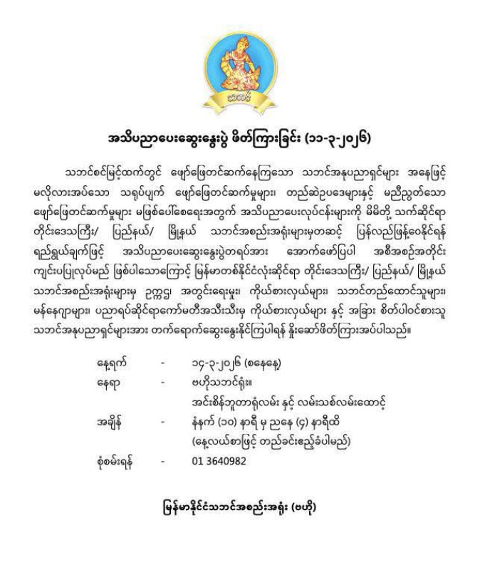 သဘင်အနုပညာရှင်များ မလိုလားအပ်သော သရုပ်ပျက်ဖျော်ဖြေမှုများနှင့် ဥပဒေများနှင့်မညီသော ဖျော်ဖြေမှုများ မဖြစ်ပေါ်စေရန် အသိပညာပေးဆွေးနွေးပွဲကျင်းပမည်ဖြစ်ကြောင်း မြန်မာနိုင်ငံသဘင်အစည်းအရုံး (ဗဟို)က အသိပေးထုတ်ပြန်ထားသည်။