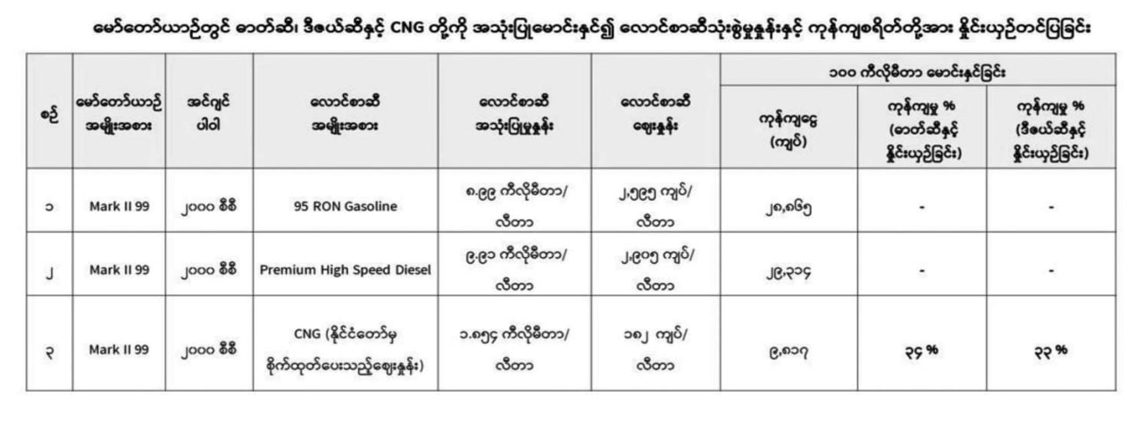 ထိုသို႔ေရာင္းခ်ေပးေနေသာ ေဈးႏႈန္းသည္ ႏိုင္ငံတကာေဈးႏႈန္းႏွင့္ ႏႈိင္းယွဥ္ပါက ထက္ဝက္ခန႔္ သက္သာေနေၾကာင္း၊ စက္စြမ္းအားတူညီသည့္ ေမာ္ေတာ္ယာဥ္မ်ားတြင္ ဓာတ္ဆီ၊ ဒီဇယ္ႏွင့္ CNG တို႔အား တူညီခရီးအကြာအေဝးအတြက္ ေလာင္စာဆီကုန္က်စရိတ္ကို ႏႈိင္းယွဥ္ပါက CNG သည္ သုံးပုံတစ္ပုံခန႔္သာကုန္က်မည္ျဖစ္ေၾကာင္း၊ CNG သုံး Taxi ယာဥ္မ်ားအေနျဖင့္ ႏိုင္ငံေတာ္မွ စိုက္ထုတ္ေပးထားသည့္ အခြင့္အေရးကို ျပည္သူမ်ား ခံစားခြင့္ရရွိေစရန္ ပူးေပါင္းေဆာင္႐ြက္ၾကေစလိုေၾကာင္း ေျပာၾကားခဲ့ေၾကာင္း သိရသည္။