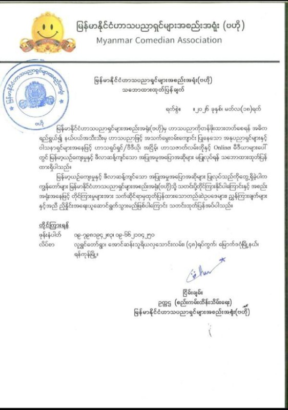 ျမန္မာႏိုင္ငံဟာသပညာရွင္မ်ားအစည္းအ႐ုံး(ဗဟို)မွ ဟာသပညာကိုတန္ဖိုးထားတတ္ေစရန္ အဓိက ရည္႐ြယ္၍ နယ္ပယ္အသီးသီးမွ ဟာသပညာျဖင့္ အသက္ေမြးဝမ္းေက်ာင္း ျပဳေနေသာ အႏုပညာရွင္မ်ားႏွင့္ ဝါသနာရွင္မ်ားအေနျဖင့္ ဟာသ႐ုပ္ရွင္၊ ဗီဒီယို၊ အၿငိမ့္၊ ဟာသဇာတ္လမ္းတိုႏွင့္ Online မီဒီယာမ်ားေပၚ တြင္ ျမန္မာ့ယဥ္ေက်းမႈႏွင့္ ဖီလာဆန႔္က်င္ေသာ အျပဳအမူအေျပာအဆိုမ်ား မျပဳလုပ္ရန္ ယေန႔ (မတ္လ ၁၈ရက္)က အသိေပးထုတ္ျပန္ထားသည္။