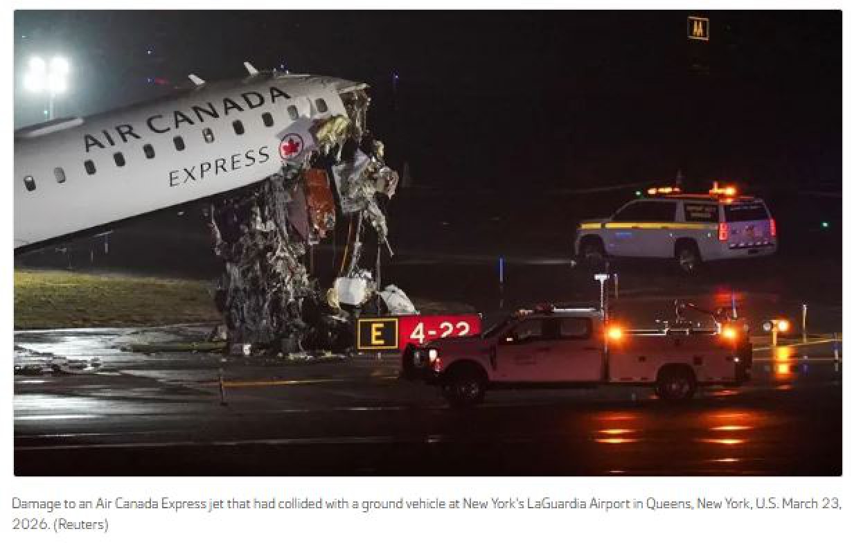အမေရိကန်နိုင်ငံ နယူးယောက်မြို့က LaGuardia လေဆိပ်မှာ ဆင်းသက်ခဲ့တဲ့ Air Canada Express ဂျက်လေယာဉ်တစ်စင်းဟာ ဆင်းသက်ချိန်အတွင်း မီးသတ်ကားတစ်စီးနဲ့တိုက်မိခဲ့ပြီး လေယာဥ်မှူးနှစ်ဦး စလုံး သေဆုံးခဲ့တယ်လို့ သိရပါတယ်။