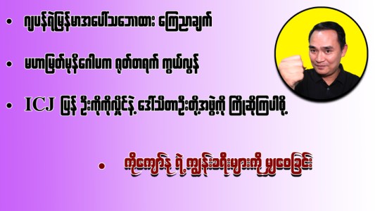 ICJ ပြန် ဦးကိုကိုလှိုင်နဲ့ ဒေါ်သီတာဦးတို့အဖွဲ့ကို ကြိုဆိုကြပါစို့၊ ဂျပန်ရဲ့မြန်မာအပေါ်သဘောထား ကြေညာချက်၊ မဟာမြတ်မုနိဂေါပက ရုတ်တရက် ကွယ်လွန်၊ ကိုကျော်နုရဲ့ ကျွန်းခရီးများကို မျှဝေခြင်း (၃၁-၁-၂၀၂၆)